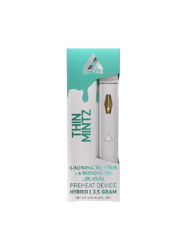 We use a blend of cannabinoids, including HXY9-THC, THCM, HXY8-THC, and Live Resin. The device has a pre-heat button filled with approximately 3.5 grams of a cannabinoid blend.
