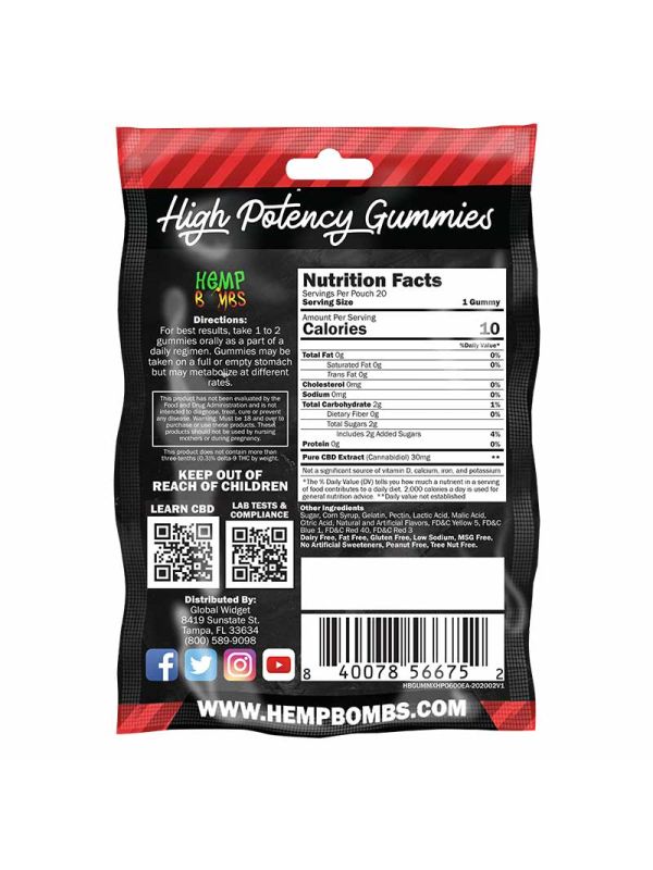 Get more from your CBD routine with Hemp Bombs® 20-Count High Potency CBD Gummies. Each chew delivers a pre-measured 30mg serving of premium CBD in a mess-free, delicious way.