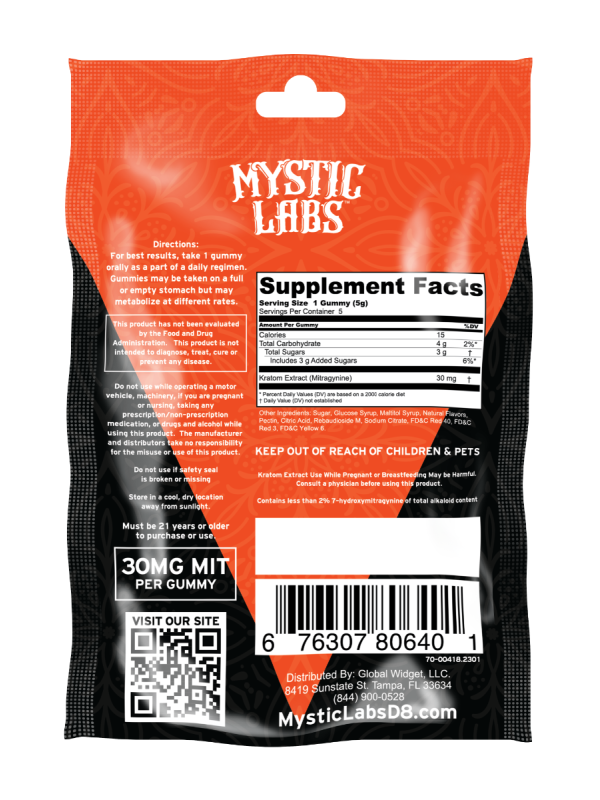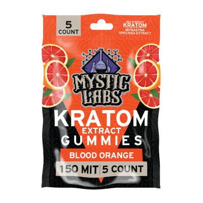 Mystic Labs™ 5ct Kratom Gummies deliver the all-encompassing effects of Kratom in a bite-sized edible. Our Kratom-infused gummies feature a delicious blood orange flavor and contain a max-strength 30mg serving of Mitragynine (MIT) per gummy.