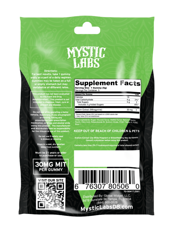 Mystic Labs™ 5ct Kratom Gummies deliver the all-encompassing effects of Kratom in a bite-sized edible. Our Kratom-infused gummies feature a delicious lime flavor and contain a max-strength 30mg serving of Mitragynine (MIT) per gummy.
