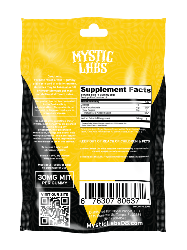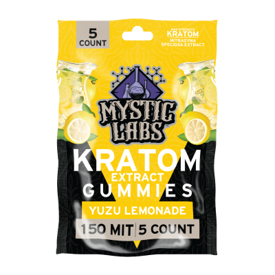 Mystic Labs™ 5ct Kratom Gummies deliver the all-encompassing effects of Kratom in a bite-sized edible. Our Kratom-infused gummies feature a delicious lemonade flavor and contain a max-strength 30mg serving of Mitragynine (MIT) per gummy.