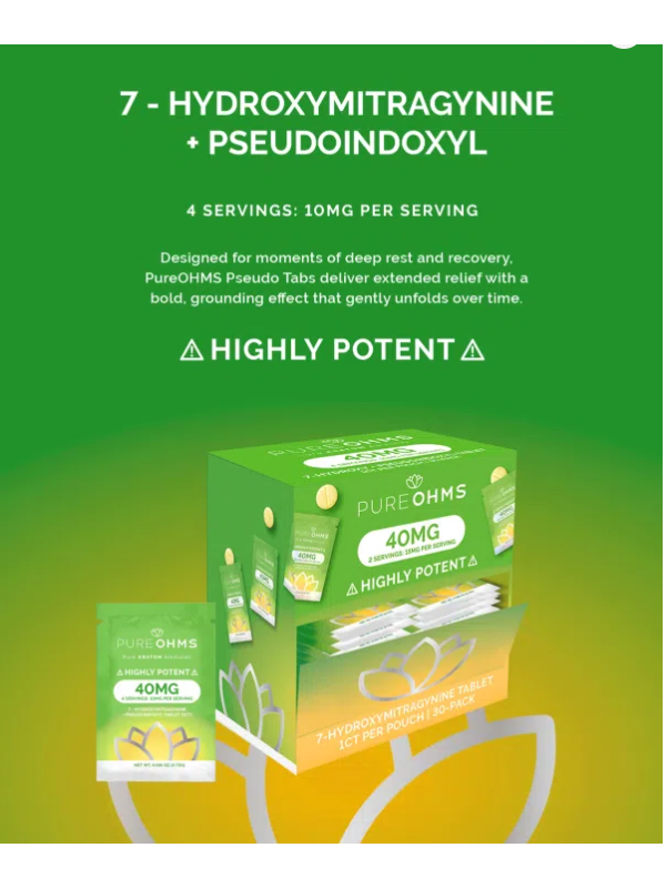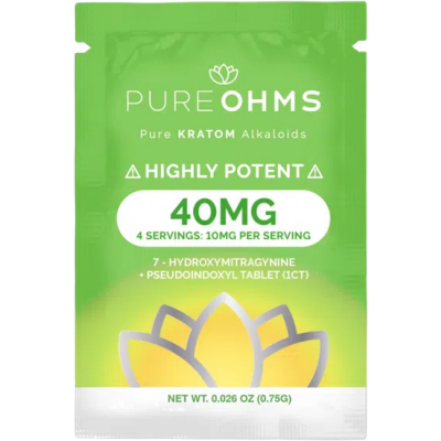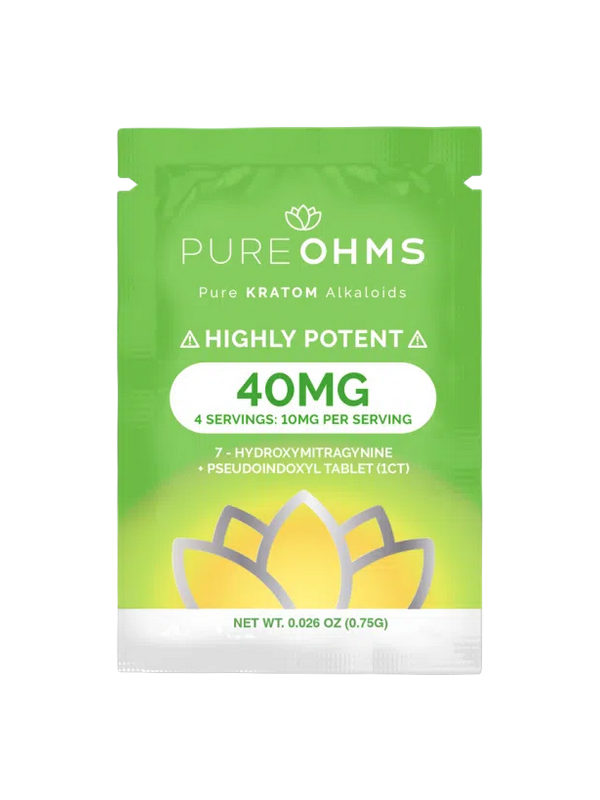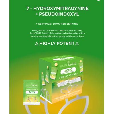 Pure Ohms Green 40mg Singles deliver a powerful combination of 7-Hydroxymitragynine and Pseudoindoxyl in a refreshing mint-flavored tablet. Each tab is precision-dosed at 40mg, split into four convenient servings, making it ideal for experienced kratom users who want a clean, high-potency option without the mess of powders or tinctures. Crafted for consistency, rapid release, and discretion, this single-tab format offers a balanced, reliable experience in every serving.